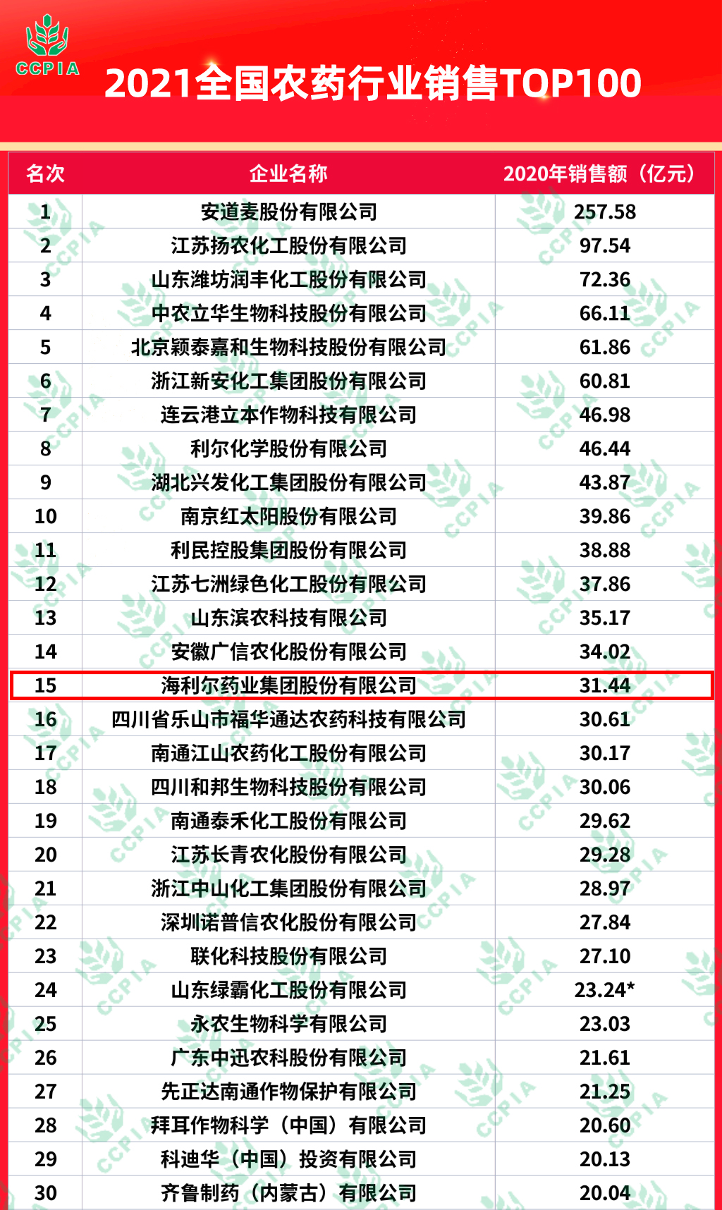 Good news! Hailier Pharmaceutical Group won the 15th place in the top 100 sales of national pesticide industry in 2021