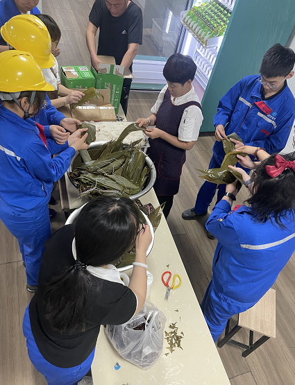 ? ? ? ?為了更好實現家文化與節日文化的互動相融,人力行政處提前購置糯米、蜜棗、豆沙、蛋黃、五花肉、粽葉等包粽子的材料,并于節前一天做好了準備工作。糯米、粽葉等必備材料被整齊的擺上桌,大家一起齊動手相互交流學習包粽子的技巧,大家還一起分享五彩繩相互給彼此系上,整個活動現場歡聲笑語、其樂融融。